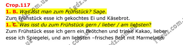 Стор.117 1. B. Was isst man zum Frühstück? Sage. Zum Frühstück esse ich gekochtes Ei und Käsebrot. 1. C. Was isst du zum Frühstück gern / lieber / am liebsten? Zum Frühstück esse ich gern ein Brötchen und trinke Kakao, lieber esse ich Spiegelei, und am liebsten –frisches Brot mit Marmelade.