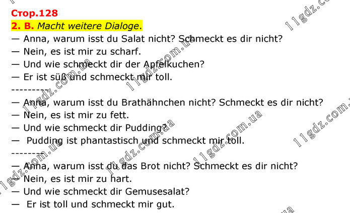 2. B. Macht weitere Dialoge. — Anna, warum isst du Salat nicht? Schmeckt es dir nicht? — Nein, es ist mir zu scharf. — Und wie schmeckt dir der Apfelkuchen? — Er ist süß und schmeckt mir toll. --------- — Anna, warum isst du Brathähnchen nicht? Schmeckt es dir nicht? — Nein, es ist mir zu fett. — Und wie schmeckt dir Pudding? — Pudding ist phantastisch und schmeckt mir toll. -------- — Anna, warum isst du das Brot nicht? Schmeckt es dir nicht? — Nein, es ist mir zu hart. — Und wie schmeckt dir Gemusesalat? — Er ist toll und schmeckt mir gut.