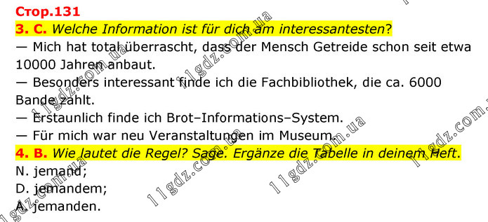 3. C. Welche Information ist für dich am interessantesten? — Mich hat total überrascht, dass der Mensch Getreide schon seit etwa 10000 Jahren anbaut. — Besonders interessant finde ich die Fachbibliothek, die ca. 6000 Bande zahlt. — Erstaunlich finde ich Brot–Informations–System. — Für mich war neu Veranstaltungen im Museum. 4. B. Wie lautet die Regel? Sage. Ergänze die Tabelle in deinem Heft. N. jemand; D. jemandem; A. jemanden.