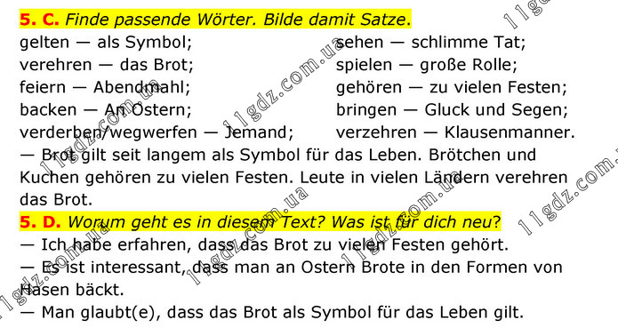 5. C. Finde passende Wörter. Bilde damit Satze. gelten — als Symbol; verehren — das Brot; feiern — Abendmahl; backen — An Ostern; verderben/wegwerfen — Jemand; sehen — schlimme Tat; spielen — große Rolle; gehören — zu vielen Festen; bringen — Gluck und Segen; verzehren — Klausenmanner. — Brot gilt seit langem als Symbol für das Leben. Brötchen und Kuchen gehören zu vielen Festen. Leute in vielen Ländern verehren das Brot. 5. D. Worum geht es in diesem Text? Was ist für dich neu? — Ich habe erfahren, dass das Brot zu vielen Festen gehört. — Es ist interessant, dass man an Ostern Brote in den Formen von Hasen bäckt. — Man glaubt(e), dass das Brot als Symbol für das Leben gilt.