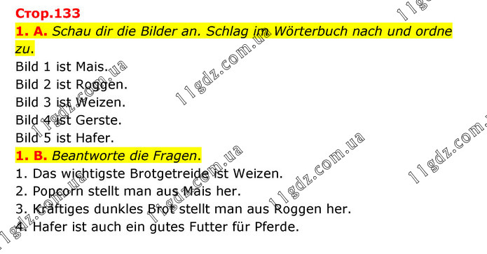 1. A. Schau dir die Bilder an. Schlag im Wörterbuch nach und ordne zu. Bild 1 ist Mais. Bild 2 ist Roggen. Bild 3 ist Weizen. Bild 4 ist Gerste. Bild 5 ist Hafer. 1. B. Beantworte die Fragen. 1. Das wichtigste Brotgetreide ist Weizen. 2. Popcorn stellt man aus Mais her. 3. Kräftiges dunkles Brot stellt man aus Roggen her. 4. Hafer ist auch ein gutes Futter für Pferde.