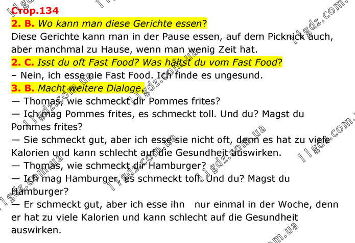 2. B. Wo kann man diese Gerichte essen? Diese Gerichte kann man in der Pause essen, auf dem Picknick auch, aber manchmal zu Hause, wenn man wenig Zeit hat. 2. C. Isst du oft Fast Food? Was hältst du vom Fast Food? – Nein, ich esse nie Fast Food. Ich finde es ungesund. 3. B. Macht weitere Dialoge. — Thomas, wie schmeckt dir Pommes frites? — Ich mag Pommes frites, es schmeckt toll. Und du? Magst du Pommes frites? — Sie schmeckt gut, aber ich esse sie nicht oft, denn es hat zu viele Kalorien und kann schlecht auf die Gesundheit auswirken. — Thomas, wie schmeckt dir Hamburger? — Ich mag Hamburger, es schmeckt toll. Und du? Magst du Hamburger? — Er schmeckt gut, aber ich esse ihn nur einmal in der Woche, denn er hat zu viele Kalorien und kann schlecht auf die Gesundheit auswirken.