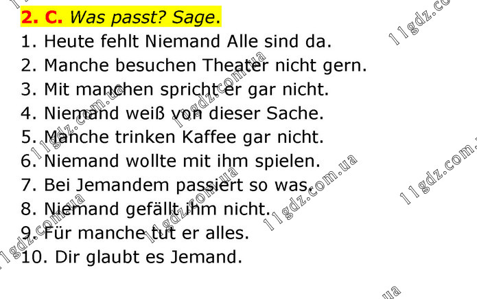 2. C. Was passt? Sage. 1. Heute fehlt Niemand Alle sind da. 2. Manche besuchen Theater nicht gern. 3. Mit manchen spricht er gar nicht. 4. Niemand weiß von dieser Sache. 5. Manche trinken Kaffee gar nicht. 6. Niemand wollte mit ihm spielen. 7. Bei Jemandem passiert so was. 8. Niemand gefällt ihm nicht. 9. Für manche tut er alles. 10. Dir glaubt es Jemand.