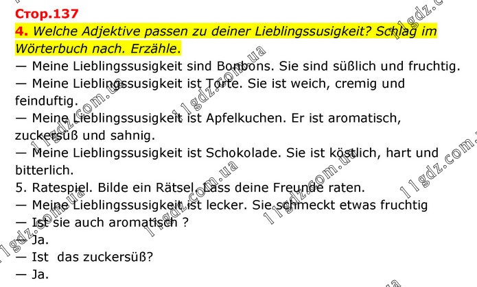 4. Welche Adjektive passen zu deiner Lieblingssusigkeit? Schlag im Wörterbuch nach. Erzähle. — Meine Lieblingssusigkeit sind Bonbons. Sie sind süßlich und fruchtig. — Meine Lieblingssusigkeit ist Torte. Sie ist weich, cremig und feinduftig. — Meine Lieblingssusigkeit ist Apfelkuchen. Er ist aromatisch, zuckersüß und sahnig. — Meine Lieblingssusigkeit ist Schokolade. Sie ist köstlich, hart und bitterlich. 5. Ratespiel. Bilde ein Rätsel. Lass deine Freunde raten. — Meine Lieblingssusigkeit ist lecker. Sie schmeckt etwas fruchtig — Ist sie auch aromatisch ? — Ja. — Ist das zuckersüß? — Ja.