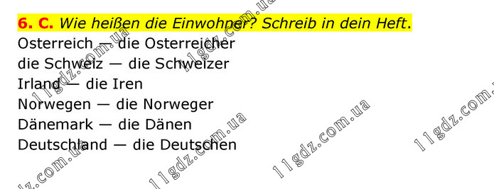 6. C. Wie heißen die Einwohner? Schreib in dein Heft. Osterreich — die Osterreicher die Schweiz — die Schweizer Irland — die Iren Norwegen — die Norweger Dänemark — die Dänen Deutschland — die Deutschen
