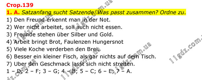 1. A. Satzanfang sucht Satzende. Was passt zusammen? Ordne zu. 1) Den Freund erkennt man in der Not. 2) Wer nicht arbeitet, soll auch nicht essen. 3) Freunde stehen über Silber und Gold. 4) Arbeit bringt Brot, Faulenzen Hungersnot 5) Viele Koche verderben den Brei. 6) Besser ein kleiner Fisch, als gar nichts auf dem Tisch. 7) Uber den Geschmack lasst sich nicht streiten. 1 – D; 2 – F; 3 – G; 4 – B; 5 – C; 6 – E; 7 – A.