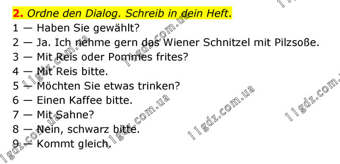 2. Ordne den Dialog. Schreib in dein Heft. 1 — Haben Sie gewählt? 2 — Ja. Ich nehme gern das Wiener Schnitzel mit Pilzsoße. 3 — Mit Reis oder Pommes frites? 4 — Mit Reis bitte. 5 — Möchten Sie etwas trinken? 6 — Einen Kaffee bitte. 7 — Mit Sahne? 8 — Nein, schwarz bitte. 9 — Kommt gleich.