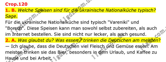 Стор.120 1. B. Welche Speisen sind für die ukrainische Nationalküche typisch? Sage. Für die ukrainische Nationalküche sind typisch "Vareniki" und "Borsch". Diese Speisen kann man sowohl selbst zubereiten, als auch im Internet bestellen. Sie sind nicht nur lecker, als auch gesund. 2. A. Was glaubst du? Was essen / trinken die Deutschen am meisten? — Ich glaube, dass die Deutschen viel Fleisch und Gemüse essen. Am meisten trinken sie das Bier, besonders in dem Urlaub, und Kaffee zu Hause und bei Arbeit.
