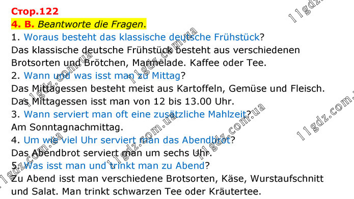 4. B. Beantworte die Fragen. 1. Woraus besteht das klassische deutsche Frühstück? Das klassische deutsche Frühstück besteht aus verschiedenen Brotsorten und Brötchen, Marmelade. Kaffee oder Tee. 2. Wann und was isst man zu Mittag? Das Mittagessen besteht meist aus Kartoffeln, Gemüse und Fleisch. Das Mittagessen isst man von 12 bis 13.00 Uhr. 3. Wann serviert man oft eine zusätzliche Mahlzeit? Am Sonntagnachmittag. 4. Um wie viel Uhr serviert man das Abendbrot? Das Abendbrot serviert man um sechs Uhr. 5. Was isst man und trinkt man zu Abend? Zu Abend isst man verschiedene Brotsorten, Käse, Wurstaufschnitt und Salat. Man trinkt schwarzen Tee oder Kräutertee.