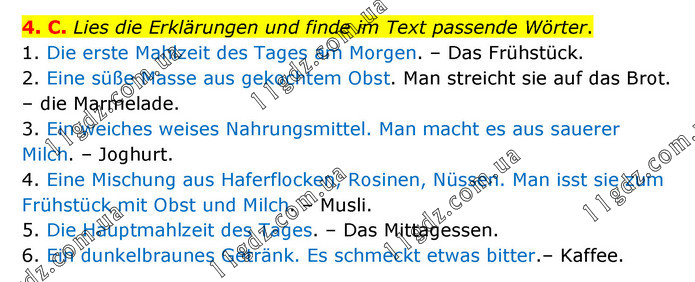 4. C. Lies die Erklärungen und finde im Text passende Wörter. 1. Die erste Mahlzeit des Tages am Morgen. – Das Frühstück. 2. Eine süße Masse aus gekochtem Obst. Man streicht sie auf das Brot. – die Marmelade. 3. Ein weiches weises Nahrungsmittel. Man macht es aus sauerer Milch. – Joghurt. 4. Eine Mischung aus Haferflocken, Rosinen, Nüssen. Man isst sie zum Frühstück mit Obst und Milch. – Musli. 5. Die Hauptmahlzeit des Tages. – Das Mittagessen. 6. Ein dunkelbraunes Getränk. Es schmeckt etwas bitter.– Kaffee.
