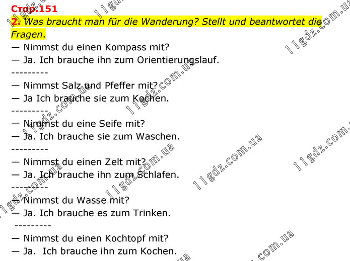 2. Was braucht man für die Wanderung? Stellt und beantwortet die Fragen. — Nimmst du einen Kompass mit? — Ja. Ich brauche ihn zum Orientierungslauf. --------- — Nimmst Salz und Pfeffer mit? — Ja Ich brauche sie zum Kochen. --------- — Nimmst du eine Seife mit? — Ja. Ich brauche sie zum Waschen. --------- — Nimmst du einen Zelt mit? — Ja. Ich brauche ihn zum Schlafen. --------- — Nimmst du Wasse mit? — Ja. Ich brauche es zum Trinken. --------- — Nimmst du einen Kochtopf mit? — Ja. Ich brauche ihn zum Kochen.