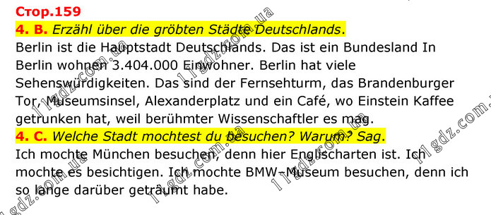 4. B. Erzähl über die gröbten Städte Deutschlands. Berlin ist die Hauptstadt Deutschlands. Das ist ein Bundesland In Berlin wohnen 3.404.000 Einwohner. Berlin hat viele Sehenswürdigkeiten. Das sind der Fernsehturm, das Brandenburger Tor, Museumsinsel, Alexanderplatz und ein Café, wo Einstein Kaffee getrunken hat, weil berühmter Wissenschaftler es mag. 4. C. Welche Stadt mochtest du besuchen? Warum? Sag. Ich mochte München besuchen, denn hier Englischarten ist. Ich mochte es besichtigen. Ich mochte BMW–Museum besuchen, denn ich so lange darüber geträumt habe.
