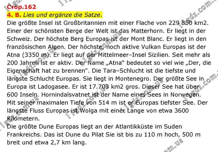 4. B. Lies und ergänze die Satze. Die größte Insel ist Großbritannien mit einer Flache von 229 850 km2. Einer der schönsten Berge der Welt ist das Matterhorn. Er liegt in der Schweiz. Der höchste Berg Europas ist der Mont Blanc. Er liegt in den französischen Alpen. Der höchste, noch aktive Vulkan Europas ist der Atna (3350 m). Er liegt auf der Mittelmeer–Insel Sizilien. Seit mehr als 200 Jahren ist er aktiv. Der Name „Atna“ bedeutet so viel wie „Der, die Eigenschaft hat zu brennen". Die Tara–Schlucht ist die tiefste und längste Schlucht Europas. Sie liegt in Montenegro. Der größte See in Europa ist Ladogasee. Er ist 17.703 km2 gros. Dieser See hat über 600 Inseln. Hornindalsvatnet ist der Name eines Sees in Norwegen. Mit seiner maximalen Tiefe von 514 m ist er Europas tiefster See. Der längste Fluss Europas ist Wolga mit einer Lange von etwa 3600 Kilometern. Die größte Dune Europas liegt an der Atlantikküste im Suden Frankreichs. Das ist Dune du Pilat Sie ist bis zu 110 m hoch, 500 m breit und etwa 2,7 km lang.