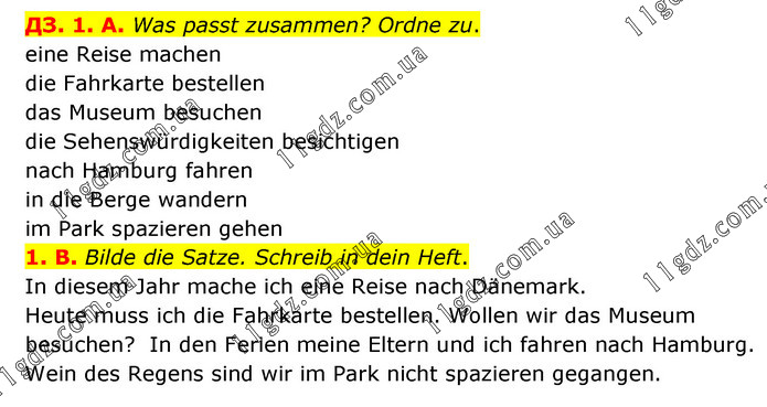 ДЗ. 1. A. Was passt zusammen? Ordne zu. eine Reise machen die Fahrkarte bestellen das Museum besuchen die Sehenswürdigkeiten besichtigen nach Hamburg fahren in die Berge wandern im Park spazieren gehen 1. B. Bilde die Satze. Schreib in dein Heft. In diesem Jahr mache ich eine Reise nach Dänemark. Heute muss ich die Fahrkarte bestellen. Wollen wir das Museum besuchen? In den Ferien meine Eltern und ich fahren nach Hamburg. Wein des Regens sind wir im Park nicht spazieren gegangen.