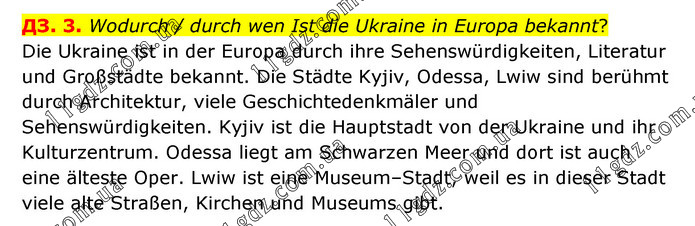 ДЗ. 3. Wodurch / durch wen Ist die Ukraine in Europa bekannt? Die Ukraine ist in der Europa durch ihre Sehenswürdigkeiten, Literatur und Großstädte bekannt. Die Städte Kyjiv, Odessa, Lwiw sind berühmt durch Architektur, viele Geschichtedenkmäler und Sehenswürdigkeiten. Kyjiv ist die Hauptstadt von der Ukraine und ihr Kulturzentrum. Odessa liegt am Schwarzen Meer und dort ist auch eine älteste Oper. Lwiw ist eine Museum–Stadt, weil es in dieser Stadt viele alte Straßen, Kirchen und Museums gibt.