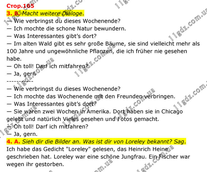 3. B. Macht weitere Dialoge. — Wie verbringst du dieses Wochenende? — Ich mochte die schone Natur bewundern. — Was Interessantes gibt’s dort? — Im alten Wald gibt es sehr große Bäume, sie sind vielleicht mehr als 100 Jahre und ungewöhnliche Pflanzen, die ich früher nie gesehen habe. — Oh toll! Darf ich mitfahren? — Ja, gern ----------- — Wie verbringst du dieses Wochenende? — Ich mochte das Wochenende mit den Freunden verbringen. — Was Interessantes gibt’s dort? — Sie waren zwei Wochen in Amerika. Dort haben sie in Chicago gelebt und natürlich Vieles gesehen und Fotos gemacht. — Oh toll! Darf ich mitfahren? — Ja, gern. 4. A. Sieh dir die Bilder an. Was ist dir von Loreley bekannt? Sag. Ich habe das Gedicht "Loreley" gelesen, das Heinrich Heine geschrieben hat. Loreley war eine schöne Jungfrau. Ein Fischer war wegen ihr gestorben.