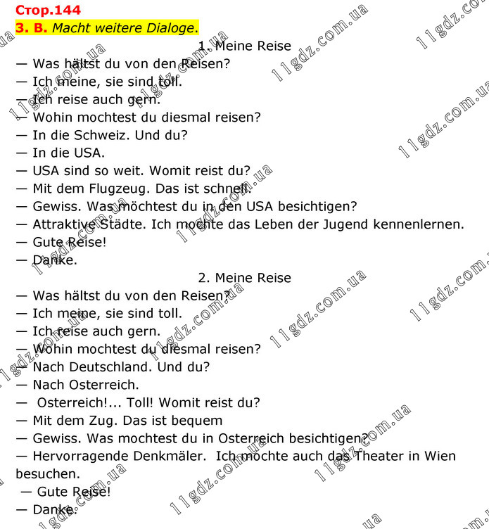 3. B. Macht weitere Dialoge. 1. Meine Reise — Was hältst du von den Reisen? — Ich meine, sie sind toll. — Ich reise auch gern. — Wohin mochtest du diesmal reisen? — In die Schweiz. Und du? — In die USA. — USA sind so weit. Womit reist du? — Mit dem Flugzeug. Das ist schnell. — Gewiss. Was möchtest du in den USA besichtigen? — Attraktive Städte. Ich mochte das Leben der Jugend kennenlernen. — Gute Reise! — Danke. 2. Meine Reise — Was hältst du von den Reisen? — Ich meine, sie sind toll. — Ich reise auch gern. — Wohin mochtest du diesmal reisen? — Nach Deutschland. Und du? — Nach Osterreich. — Osterreich!... Toll! Womit reist du? — Mit dem Zug. Das ist bequem — Gewiss. Was mochtest du in Osterreich besichtigen? — Hervorragende Denkmäler. Ich mochte auch das Theater in Wien besuchen. — Gute Reise! — Danke.