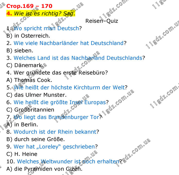 4. Wie ist es richtig? Sag. Reisen–Quiz 1. Wo spricht man Deutsch? B) in Osterreich. 2. Wie viele Nachbarländer hat Deutschland? B) sieben. 3. Welches Land ist das Nachbarland Deutschlands? C) Dänemark. 4. Wer gründete das erste Reisebüro? A) Thomas Cook. 5. Wie heißt der höchste Kirchturm der Welt? C) das Ulmer Munster. 6. Wie heißt die größte Insel Europas? C) Großbritannien 7. Wo liegt das Brandenburger Tor? A) in Berlin. 8. Wodurch ist der Rhein bekannt? B) durch seine Größe. 9. Wer hat „Loreley“ geschrieben? C) H. Heine 10. Welches Weltwunder ist noch erhalten? A) die Pyramiden von Gizeh.