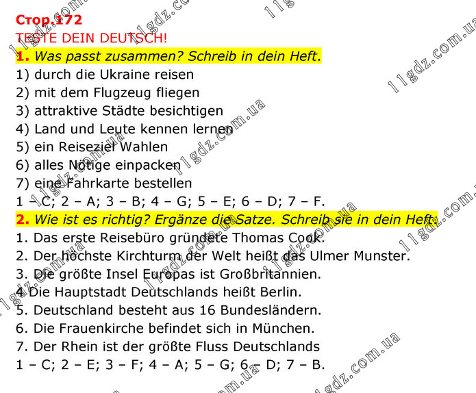 TESTE DEIN DEUTSCH! 1. Was passt zusammen? Schreib in dein Heft. 1) durch die Ukraine reisen 2) mit dem Flugzeug fliegen 3) attraktive Städte besichtigen 4) Land und Leute kennen lernen 5) ein Reiseziel Wahlen 6) alles Nötige einpacken 7) eine Fahrkarte bestellen 1 – C; 2 – A; 3 – B; 4 – G; 5 – E; 6 – D; 7 – F. 2. Wie ist es richtig? Ergänze die Satze. Schreib sie in dein Heft. 1. Das erste Reisebüro gründete Thomas Cook. 2. Der höchste Kirchturm der Welt heißt das Ulmer Munster. 3. Die größte Insel Europas ist Großbritannien. 4 Die Hauptstadt Deutschlands heißt Berlin. 5. Deutschland besteht aus 16 Bundesländern. 6. Die Frauenkirche befindet sich in München. 7. Der Rhein ist der größte Fluss Deutschlands 1 – C; 2 – E; 3 – F; 4 – A; 5 – G; 6 – D; 7 – B.