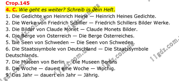 4. C. Wie geht es weiter? Schreib in dein Heft. 1. Die Gedichte von Heinrich Heine — Heinrich Heines Gedichte. 2. Die Werke von Friedrich Schiller — Friedrich Schillers Bilder Werke. 3. Die Bilder von Claude Monet — Claude Monets Bilder. 4. Die Berge von Osterreich — Die Berge Osterreiches. 5. Die Seen von Schweden — Die Seen von Schweden. 6. Die Staatssymbole von Deutschland — Die Staatssymbole Deutschlands. 7. Die Museen von Berlin — Die Museen Berlins 8. Die Woche — dauert eine Woche — Wochig. 9. Das Jahr — dauert ein Jahr — Jährig.