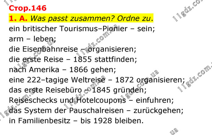 1. A. Was passt zusammen? Ordne zu. ein britischer Tourismus–Pionier – sein; arm – leben; die Eisenbahnreise – organisieren; die erste Reise – 1855 stattfinden; nach Amerika – 1866 gehen; eine 222–tagige Weltreise – 1872 organisieren; das erste Reisebüro – 1845 gründen; Reiseschecks und Hotelcoupons – einfuhren; das System der Pauschalreisen – zurückgehen; in Familienbesitz – bis 1928 bleiben.