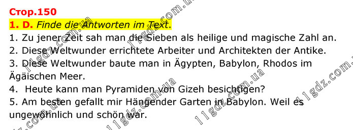 1. D. Finde die Antworten im Text. 1. Zu jener Zeit sah man die Sieben als heilige und magische Zahl an. 2. Diese Weltwunder errichtete Arbeiter und Architekten der Antike. 3. Diese Weltwunder baute man in Ägypten, Babylon, Rhodos im Ägäischen Meer. 4. Heute kann man Pyramiden von Gizeh besichtigen? 5. Am besten gefallt mir Hängender Garten in Babylon. Weil es ungewöhnlich und schön war.