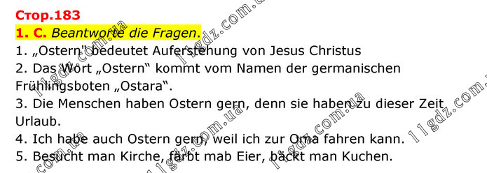 1. C. Beantworte die Fragen. 1. „Ostern" bedeutet Auferstehung von Jesus Christus 2. Das Wort „Ostern“ kommt vom Namen der germanischen Frühlingsboten „Ostara“. 3. Die Menschen haben Ostern gern, denn sie haben zu dieser Zeit Urlaub. 4. Ich habe auch Ostern gern, weil ich zur Oma fahren kann. 5. Besucht man Kirche, färbt mab Eier, bäckt man Kuchen.