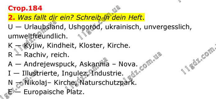 2. Was fallt dir ein? Schreib in dein Heft. U — Urlaubsland, Ushgorod, ukrainisch, unvergesslich, umweltfreundlich. K — Kyjiw, Kindheit, Kloster, Kirche. R — Rachiv, reich. A — Andrejewspuck, Askannia – Nova. I — Illustrierte, Ingulez, Industrie. N — Nikolaj– Kirche, Naturschutzpark. E — Europaische Platz.
