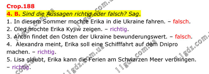 4. B. Sind die Aussagen richtig oder falsch? Sag. 1. In diesem Sommer mochte Erika in die Ukraine fahren. – falsch. 2. Oleg mochte Erika Kyjiw zeigen. – richtig. 3. Anton findet den Osten der Ukraine bewunderungswert. – falsch. 4. Alexandra meint, Erika soll eine Schifffahrt auf dem Dnipro machen. – richtig. 5. Lisa glaubt, Erika kann die Ferien am Schwarzen Meer verbringen. – richtig.