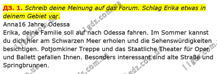 ДЗ. 1. Schreib deine Meinung auf das Forum. Schlag Erika etwas in deinem Gebiet vor. Anna16 Jahre, Odessa Erika, deine Familie soll auf nach Odessa fahren. Im Sommer kannst du dich hier am Schwarzen Meer erholen und die Sehenswürdigkeiten besichtigen. Potjomkiner Treppe und das Staatliche Theater für Oper und Ballett gefallen Ihnen. Besonders interessant sind alte Straße und Springbrunnen.