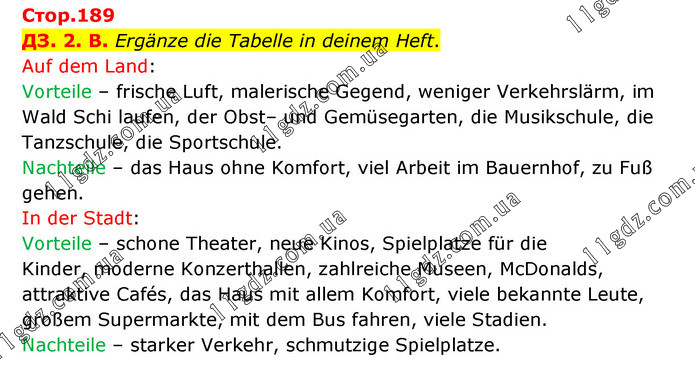 ДЗ. 2. B. Ergänze die Tabelle in deinem Heft. Auf dem Land: Vorteile – frische Luft, malerische Gegend, weniger Verkehrslärm, im Wald Schi laufen, der Obst– und Gemüsegarten, die Musikschule, die Tanzschule, die Sportschule. Nachteile – das Haus ohne Komfort, viel Arbeit im Bauernhof, zu Fuß gehen. In der Stadt: Vorteile – schone Theater, neue Kinos, Spielplatze für die Kinder, moderne Konzerthallen, zahlreiche Museen, McDonalds, attraktive Cafés, das Haus mit allem Komfort, viele bekannte Leute, großem Supermarkte, mit dem Bus fahren, viele Stadien. Nachteile – starker Verkehr, schmutzige Spielplatze.