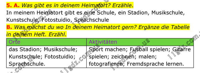 5. A. Was gibt es in deinem Heimatort? Erzähle. In meinem Heimatort gibt es eine Schule, ein Stadion, Musikschule, Kunstschule, Fotostuidio, Sprachschule B. Was machst du wo In deinem Heimatort gern? Ergänze die Tabelle in deinem Heft. Erzähl. Orte Aktivitäten das Stadion; Musikschule; Kunstschule; Fotostuidio; Sprachschule. Sport machen; Fusball spielen; Gitarre spielen; zeichnen; malen; fotografieren; Fremdsprache lernen.