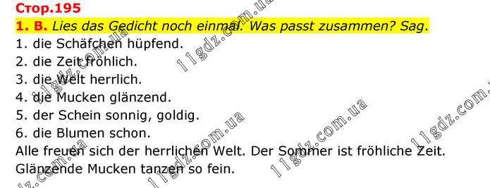 1. B. Lies das Gedicht noch einmal. Was passt zusammen? Sag. 1. die Schäfchen hüpfend. 2. die Zeit fröhlich. 3. die Welt herrlich. 4. die Mucken glänzend. 5. der Schein sonnig, goldig. 6. die Blumen schon. Alle freuen sich der herrlichen Welt. Der Sommer ist fröhliche Zeit. Glänzende Mucken tanzen so fein.