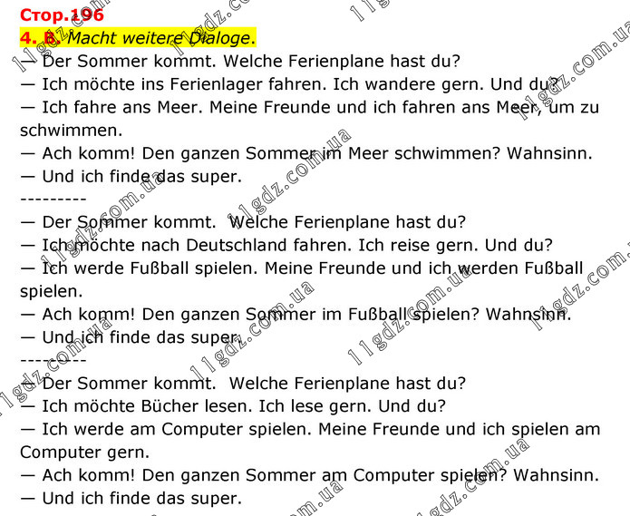 4. B. Macht weitere Dialoge. — Der Sommer kommt. Welche Ferienplane hast du? — Ich möchte ins Ferienlager fahren. Ich wandere gern. Und du? — Ich fahre ans Meer. Meine Freunde und ich fahren ans Meer, um zu schwimmen. — Ach komm! Den ganzen Sommer im Meer schwimmen? Wahnsinn. — Und ich finde das super. --------- — Der Sommer kommt. Welche Ferienplane hast du? — Ich möchte nach Deutschland fahren. Ich reise gern. Und du? — Ich werde Fußball spielen. Meine Freunde und ich werden Fußball spielen. — Ach komm! Den ganzen Sommer im Fußball spielen? Wahnsinn. — Und ich finde das super. --------- — Der Sommer kommt. Welche Ferienplane hast du? — Ich möchte Bücher lesen. Ich lese gern. Und du? — Ich werde am Computer spielen. Meine Freunde und ich spielen am Computer gern. — Ach komm! Den ganzen Sommer am Computer spielen? Wahnsinn. — Und ich finde das super.