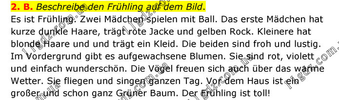 2. B. Beschreibe den Frühling auf dem Bild. Es ist Frühling. Zwei Mädchen spielen mit Ball. Das erste Mädchen hat kurze dunkle Haare, trägt rote Jacke und gelben Rock. Kleinere hat blonde Haare und und trägt ein Kleid. Die beiden sind froh und lustig. Im Vordergrund gibt es aufgewachsene Blumen. Sie sind rot, violett und einfach wunderschön. Die Vögel freuen sich auch über das warme Wetter. Sie fliegen und singen ganzen Tag. Vor dem Haus ist ein großer und schon ganz Grüner Baum. Der Frühling ist toll!