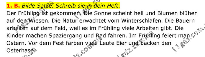1. B. Bilde Satze. Schreib sie in dein Heft. Der Frühling ist gekommen. Die Sonne scheint hell und Blumen blühen auf den Wiesen. Die Natur erwachtet vom Winterschlafen. Die Bauern arbeiten auf dem Feld, weil es im Frühling viele Arbeiten gibt. Die Kinder machen Spaziergang und Rad fahren. Im Frühling feiert man Ostern. Vor dem Fest färben viele Leute Eier und backen den Osterhase.