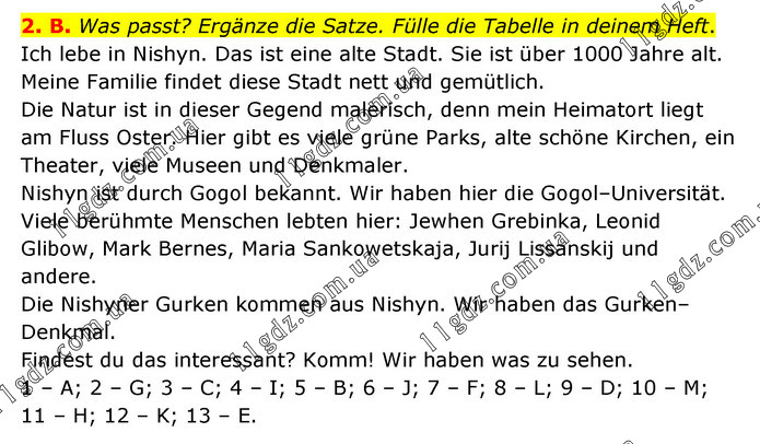 2. B. Was passt? Ergänze die Satze. Fülle die Tabelle in deinem Heft. Ich lebe in Nishyn. Das ist eine alte Stadt. Sie ist über 1000 Jahre alt. Meine Familie findet diese Stadt nett und gemütlich. Die Natur ist in dieser Gegend malerisch, denn mein Heimatort liegt am Fluss Oster. Hier gibt es viele grüne Parks, alte schöne Kirchen, ein Theater, viele Museen und Denkmaler. Nishyn ist durch Gogol bekannt. Wir haben hier die Gogol–Universität. Viele berühmte Menschen lebten hier: Jewhen Grebinka, Leonid Glibow, Mark Bernes, Maria Sankowetskaja, Jurij Lissanskij und andere. Die Nishyner Gurken kommen aus Nishyn. Wir haben das Gurken–Denkmal. Findest du das interessant? Komm! Wir haben was zu sehen. 1 – A; 2 – G; 3 – C; 4 – I; 5 – B; 6 – J; 7 – F; 8 – L; 9 – D; 10 – M; 11 – H; 12 – K; 13 – E.