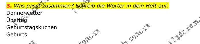 Was passt zusammen? Schreib die Worter in dein Heft auf. Donnerwetter Übertag Geburtstagskuchen Geburts