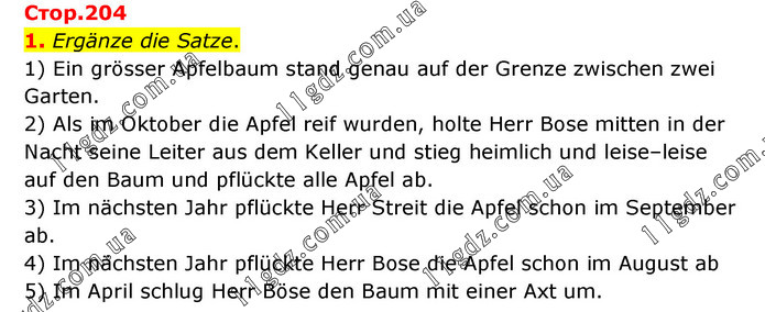 1. Ergänze die Satze. 1) Ein grösser Apfelbaum stand genau auf der Grenze zwischen zwei Garten. 2) Als im Oktober die Apfel reif wurden, holte Herr Bose mitten in der Nacht seine Leiter aus dem Keller und stieg heimlich und leise–leise auf den Baum und pflückte alle Apfel ab. 3) Im nächsten Jahr pflückte Herr Streit die Apfel schon im September ab. 4) Im nächsten Jahr pflückte Herr Bose die Apfel schon im August ab 5) Im April schlug Herr Böse den Baum mit einer Axt um.