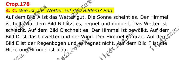 4. C. Wie ist das Wetter auf den Bildem? Sag. Auf dem Bild A ist das Wetter gut. Die Sonne scheint es. Der Himmel ist hell. Auf dem Bild B blitzt es, regnet und donnert. Das Wetter ist schlecht. Auf dem Bild C schneit es. Der Himmel ist bewölkt. Auf dem Bild D ist das Unwetter und der Wind. Der Himmel ist grau. Auf dem Bild E ist der Regenbogen und es regnet nicht. Auf dem Bild F ist die Hitze und Himmel ist blau.