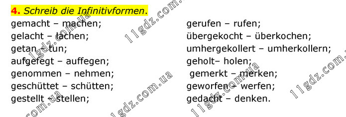 Schreib die Infinitivformen. gemacht – machen; gelacht – lachen; getan – tun; aufgefegt – auffegen; genommen – nehmen; geschüttet – schütten; gestellt – stellen; gerufen – rufen; übergekocht – überkochen; umhergekollert – umherkollern; geholt– holen; gemerkt – merken; geworfen – werfen; gedacht – denken.