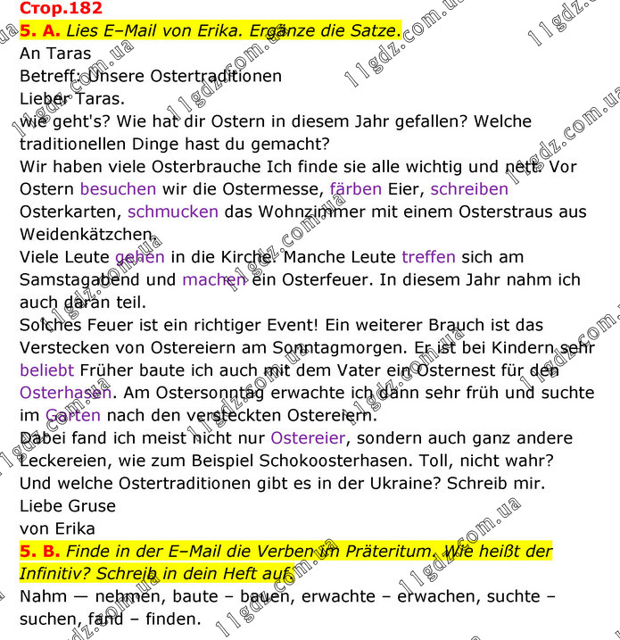 5. A. Lies E–Mail von Erika. Ergänze die Satze. An Taras Betreff: Unsere Ostertraditionen Lieber Taras. wie geht's? Wie hat dir Ostern in diesem Jahr gefallen? Welche traditionellen Dinge hast du gemacht? Wir haben viele Osterbrauche Ich finde sie alle wichtig und nett. Vor Ostern besuchen wir die Ostermesse, färben Eier, schreiben Osterkarten, schmucken das Wohnzimmer mit einem Osterstraus aus Weidenkätzchen. Viele Leute gehen in die Kirche. Manche Leute treffen sich am Samstagabend und machen ein Osterfeuer. In diesem Jahr nahm ich auch daran teil. Solches Feuer ist ein richtiger Event! Ein weiterer Brauch ist das Verstecken von Ostereiern am Sonntagmorgen. Er ist bei Kindern sehr beliebt Früher baute ich auch mit dem Vater ein Osternest für den Osterhasen. Am Ostersonntag erwachte ich dann sehr früh und suchte im Garten nach den versteckten Ostereiern. Dabei fand ich meist nicht nur Ostereier, sondern auch ganz andere Leckereien, wie zum Beispiel Schokoosterhasen. Toll, nicht wahr? Und welche Ostertraditionen gibt es in der Ukraine? Schreib mir. Liebe Gruse von Erika 5. B. Finde in der E–Mail die Verben im Präteritum. Wie heißt der Infinitiv? Schreib in dein Heft auf. Nahm — nehmen, baute – bauen, erwachte – erwachen, suchte – suchen, fand – finden.