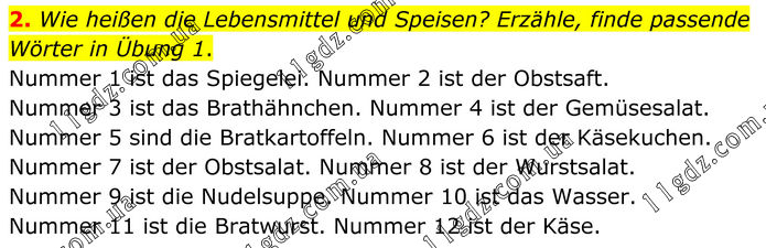 2. Wie heißen die Lebensmittel und Speisen? Erzähle, finde passende Wörter in Übung 1. Nummer 1 ist das Spiegelei. Nummer 2 ist der Obstsaft. Nummer 3 ist das Brathähnchen. Nummer 4 ist der Gemüsesalat. Nummer 5 sind die Bratkartoffeln. Nummer 6 ist der Käsekuchen. Nummer 7 ist der Obstsalat. Nummer 8 ist der Wurstsalat. Nummer 9 ist die Nudelsuppe. Nummer 10 ist das Wasser. Nummer 11 ist die Bratwurst. Nummer 12 ist der Käse.