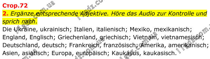 2. Ergänze entsprechende Adjektive. Höre das Audio zur Kontrolle und sprich nach. Die Ukraine, ukrainisch; Italien, italienisch; Mexiko, mexikanisch; England, Englisch; Griechenland, griechisch; Vietnam, vietnamesisch; Deutschland, deutsch; Frankreich, französisch; Amerika, amerikanisch; Asien, asiatisch; Europa, europäisch; Kaukasus, kaukasisch.