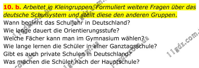 10. b. Arbeitet in Kleingruppen. Formuliert weitere Fragen über das deutsche Schulsystem und stellt diese den anderen Gruppen. Wann beginnt das Schuljahr in Deutschland? Wie lange dauert die Orientierungsstufe? Welche Fächer kann man im Gymnasium wählen? Wie lange lernen die Schüler in einer Ganztagsschule? Gibt es auch private Schulen in Deutschland? Was machen die Schüler nach der Hauptschule?