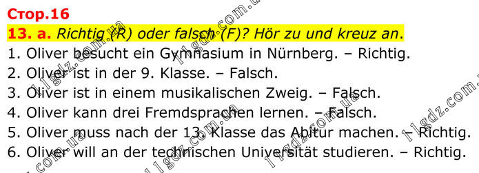 13. a. Richtig (R) oder falsch (F)? Hör zu und kreuz an. 1. Oliver besucht ein Gymnasium in Nürnberg. – Richtig. 2. Oliver ist in der 9. Klasse. – Falsch. 3. Oliver ist in einem musikalischen Zweig. – Falsch. 4. Oliver kann drei Fremdsprachen lernen. – Falsch. 5. Oliver muss nach der 13. Klasse das Abitur machen. – Richtig. 6. Oliver will an der technischen Universität studieren. – Richtig.