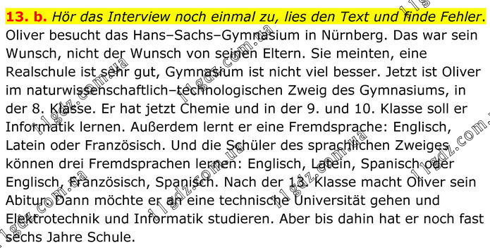13. b. Hör das Interview noch einmal zu, lies den Text und finde Fehler. Oliver besucht das Hans–Sachs–Gymnasium in Nürnberg. Das war sein Wunsch, nicht der Wunsch von seinen Eltern. Sie meinten, eine Realschule ist sehr gut, Gymnasium ist nicht viel besser. Jetzt ist Oliver im naturwissenschaftlich–technologischen Zweig des Gymnasiums, in der 8. Klasse. Er hat jetzt Chemie und in der 9. und 10. Klasse soll er Informatik lernen. Außerdem lernt er eine Fremdsprache: Englisch, Latein oder Französisch. Und die Schüler des sprachlichen Zweiges können drei Fremdsprachen lernen: Englisch, Latein, Spanisch oder Englisch, Französisch, Spanisch. Nach der 13. Klasse macht Oliver sein Abitur. Dann möchte er an eine technische Universität gehen und Elektrotechnik und Informatik studieren. Aber bis dahin hat er noch fast sechs Jahre Schule.