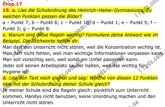 15. a. Lies die Schulordnung des Heinrich–Heine–Gymnasiums. Zu welchen Punkten passen die Bilder? a – Punkt 7; b – Punkt 6; c – Punkt 10; d – Punkt 1; e – Punkt 5; f – Punkt 2; g – Punkt 8. c. Warum sind diese Regeln wichtig? Formuliere deine Antwort wie im Beispiel. Die Stichworte helfen dir. Man darf den Unterricht nicht stören, weil die Konzentration wichtig ist. Man darf nicht fehlen, weil man wichtige Informationen verpassen kann. Man soll vorsichtig sein, weil sonst ein Unfall passieren kann. Jeder soll seinen Arbeitsplatz sauber halten, weil das wichtig für Hygiene ist. d. Lies den Text noch einmal und sag: Welche von diesen 12 Punkten sind mit der Schulordnung deiner Schule gleich? In meiner Schule sind die Regeln gleich: pünktlich zum Unterricht kommen, Handys nicht benutzen, keine Unordnung machen und den Unterricht nicht stören.