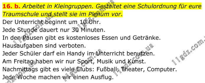 16. b. Arbeitet in Kleingruppen. Gestaltet eine Schulordnung für eure Traumschule und stellt sie im Plenum vor. Der Unterricht beginnt um 10 Uhr. Jede Stunde dauert nur 30 Minuten. In den Pausen gibt es kostenloses Essen und Getränke. Hausaufgaben sind verboten. Jeder Schüler darf ein Handy im Unterricht benutzen. Am Freitag haben wir nur Sport, Musik und Kunst. Nachmittags gibt es viele Clubs: Fußball, Theater, Computer. Jede Woche machen wir einen Ausflug.