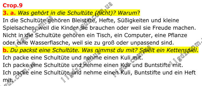 3. a. Was gehört in die Schultüte (nicht)? Warum? In die Schultüte gehören Bleistifte, Hefte, Süßigkeiten und kleine Spielsachen, weil die Kinder sie brauchen oder weil sie Freude machen. Nicht in die Schultüte gehören ein Tisch, ein Computer, eine Pflanze oder eine Wasserflasche, weil sie zu groß oder unpassend sind. b. Du packst eine Schultüte. Was nimmst du mit? Spielt ein Kettenspiel. Ich packe eine Schultüte und nehme einen Kuli mit. Ich packe eine Schultüte und nehme einen Kuli und Buntstifte mit. Ich packe eine Schultüte und nehme einen Kuli, Buntstifte und ein Heft mit.